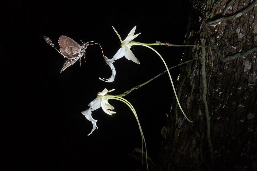 • Mekanisme: Ngengat ini memiliki belalai (proboscis) yang sangat panjang, memungkinkan ngengat mencapai nektar yang terletak jauh di dasar ‘ekor’ labellum anggrek. Ketergantungan pada satu jenis penyerbuk menjadikan reproduksi anggrek ini sangat berisiko.
