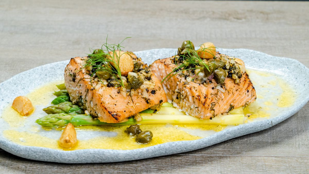 - Siapkan filet salmon, bumbui dengan garam, lada hitam, dan sedikit perasan lemon.