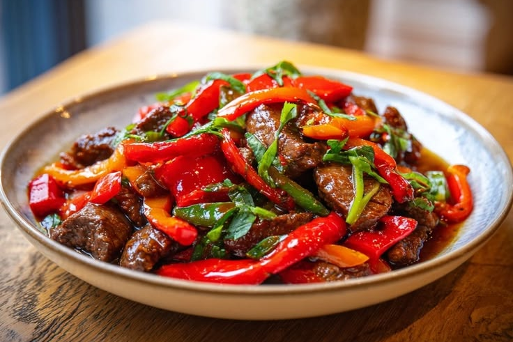 Mengapa ini mewah? Penggunaan paprika merah, kuning, dan hijau memberikan warna yang kontras dan cerah, membuat hidangan tampak dipersiapkan dengan niat mendalam.