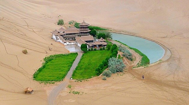 Bergeser ke jalur sutra kuno, kita menemukan perpaduan kontras yang ekstrem antara gurun pasir tandus dan oase yang indah. Danau Bulan Sabit (Crescent Lake) di Dunhuang adalah sebuah oase berbentuk bulan sabit yang dikelilingi oleh bukit pasir raksasa yang disebut Mingsha Shan (Gunung Pasir Bernyanyi).