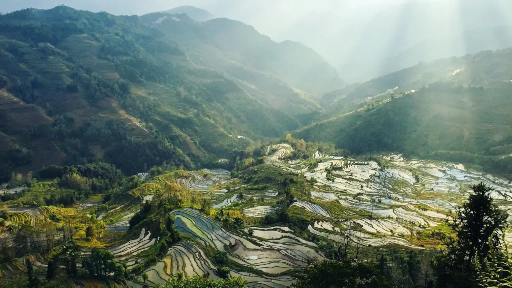 Selama lebih dari 1.300 tahun, suku Hani telah memahat lereng gunung menjadi sawah bertingkat yang menakjubkan. Terasering Yuanyang bukanlah sawah biasa; ini adalah mozaik cermin raksasa.