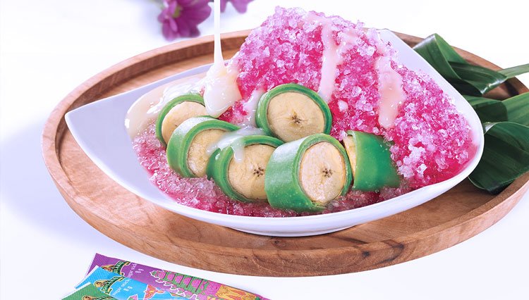 Perpaduan antara pisang yang lembut, adonan hijau yang kenyal, bubur sumsum yang gurih, dan siraman sirup manis di atas es serut menciptakan harmoni rasa dan tekstur yang luar biasa.