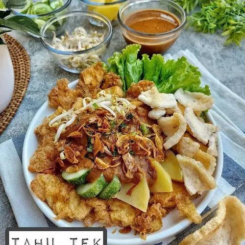 Berikut adalah resep dan cara pembuatan Tahu Tek, salah satu jajanan khas Jawa Timur yang terdiri dari tahu goreng, lontong, taoge, dan bumbu kacang yang gurih.