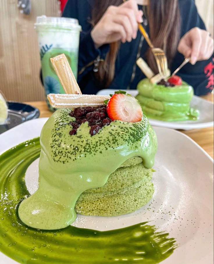 - Pancake berwarna hijau alami, sering disajikan dengan krim keju, es krim, atau sirup madu.