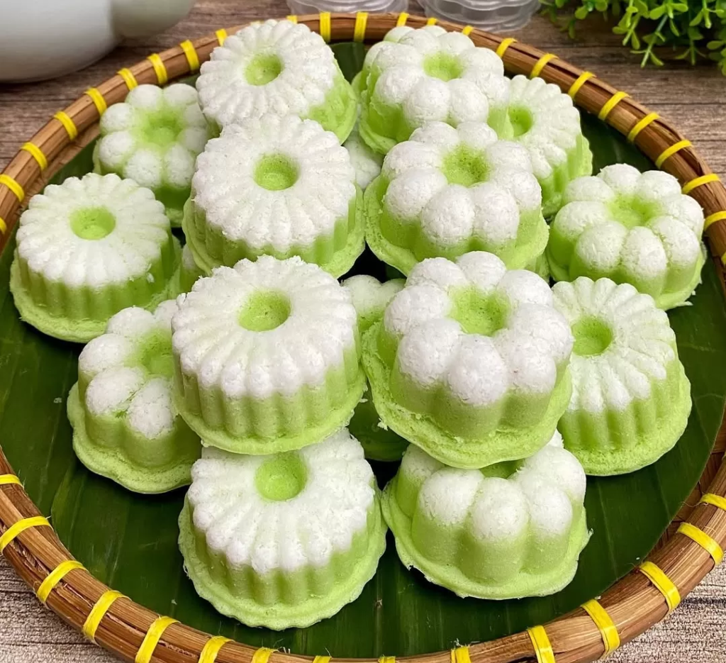 - Pengisian Adonan: Adonan hijau dituangkan di atas kelapa, tidak sampai penuh.