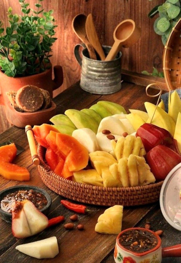 - Terbuat dari potongan buah segar (mangga muda, nanas, kedondong, dll.)