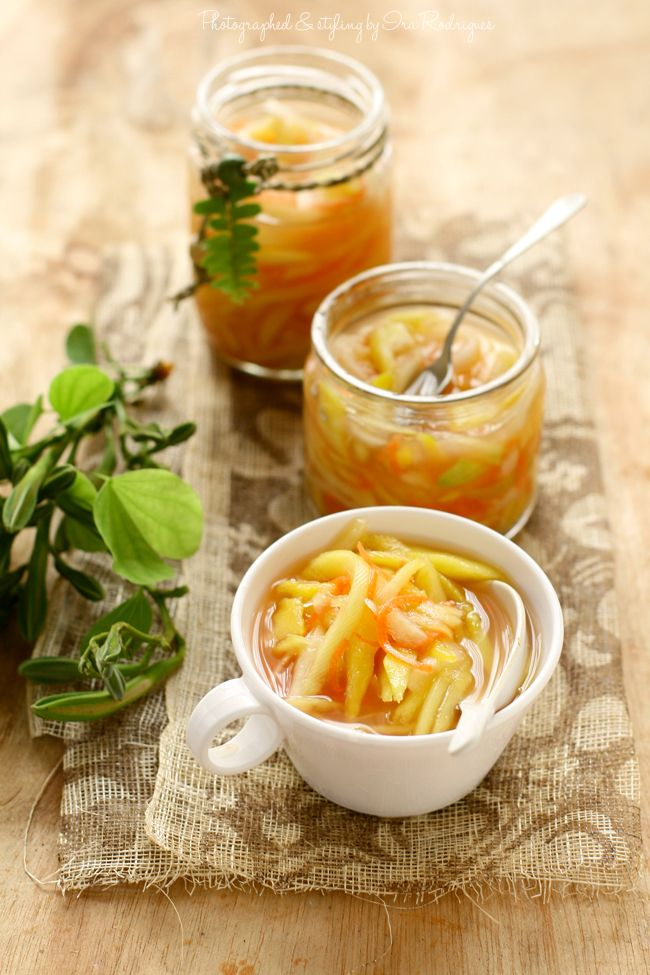 - Potongan buah segar (seringnya mangga muda) disiram kuah pindang (kaldu ikan).