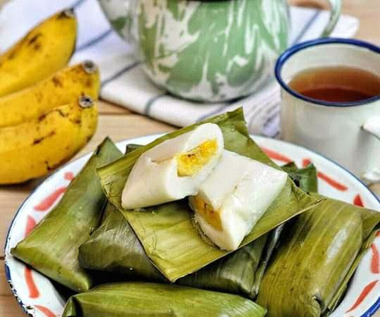 Kue berisi pisang yang dibungkus adonan tepung beras dan santan, lalu dikukus dengan daun pisang.