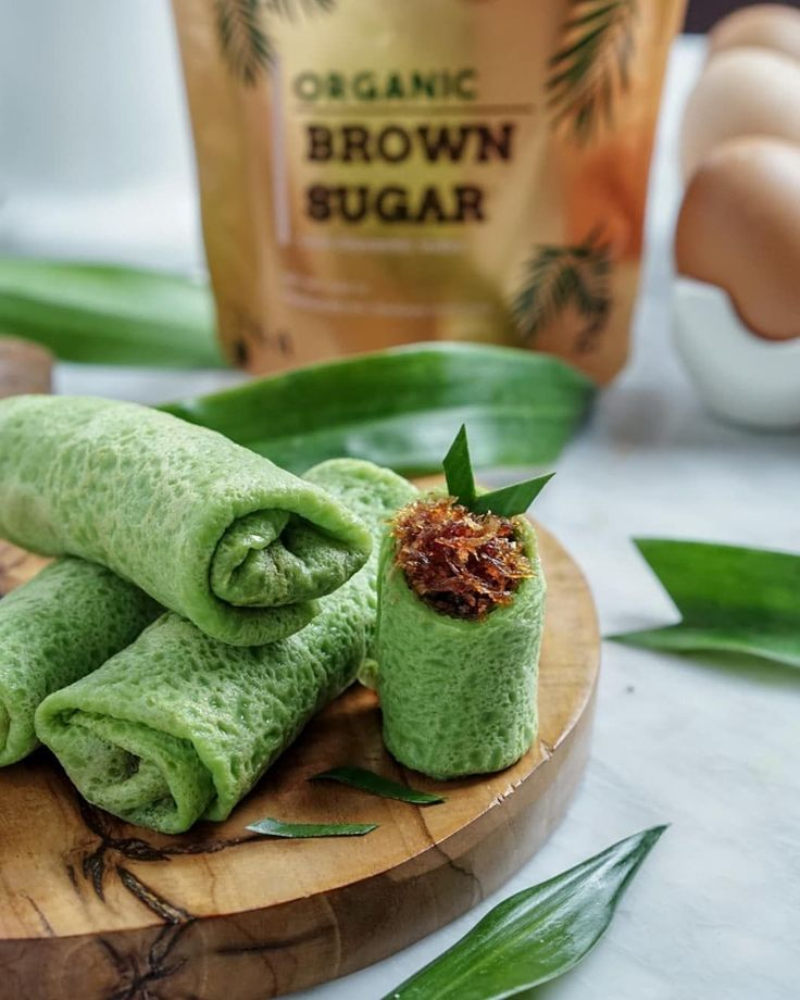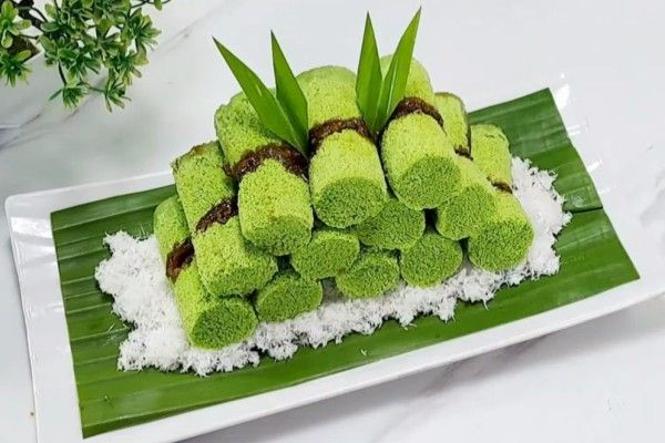 Berupa dadar hijau (karena pandan) yang diisi unti kelapa manis, kemudian digulung.