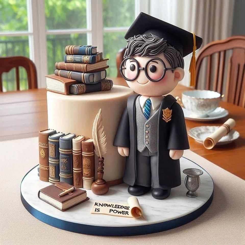 - Hiasan: Topi wisuda dari fondant, gulungan ijazah, nama lulusan